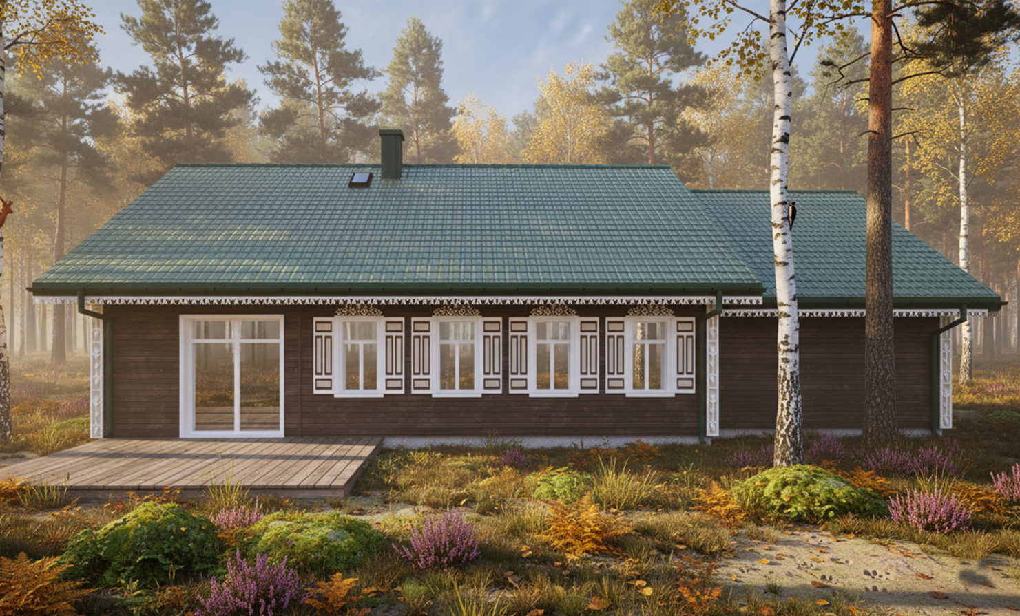 Brzezinka – Podlaski 109 to dom, który w wyjątkowy sposób łączy tradycyjny podlaski charakter z wygodą współczesnych wnętrz. Wyraźne zdobienia, dekoracyjne wiatrownice i klasyczne okiennice przywołują klimat dawnych drewnianych chat, ale sama bryła pozostaje nowoczesna, energooszczędna i dopasowana do dzisiejszego stylu życia. Wejście prowadzi do funkcjonalnej strefy komunikacyjnej, z której przechodzimy do jasnego salonu połączonego z jadalnią i kuchnią.