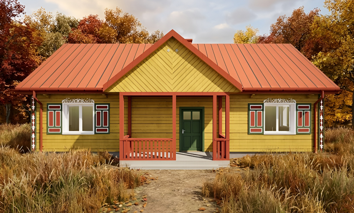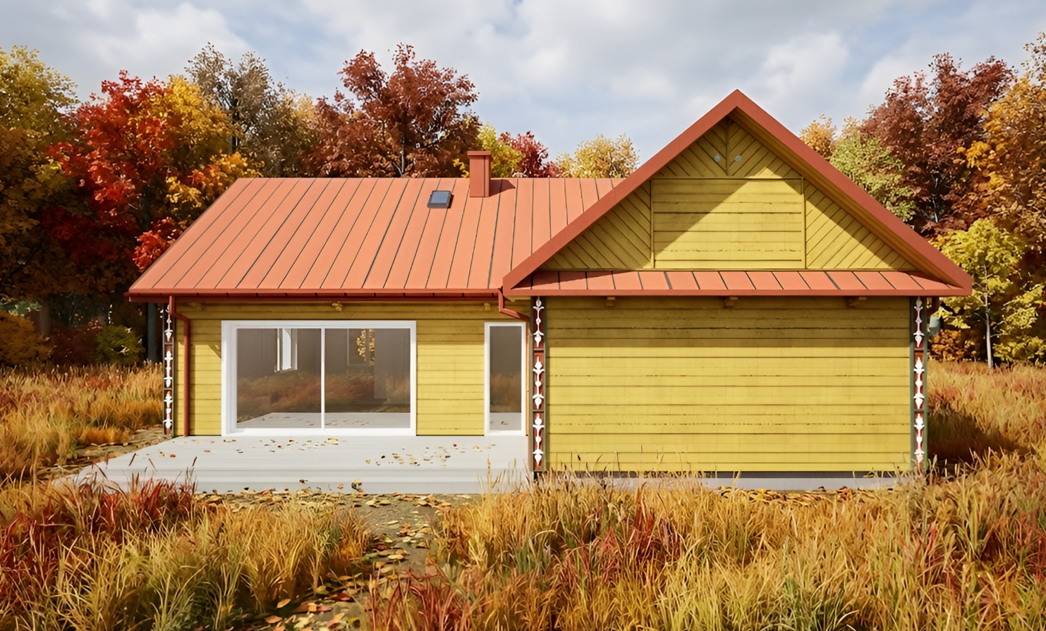Piasecznik – Podlaski 97 to parterowy dom o powierzchni 97 m², w którym tradycja podlaskiej architektury spotyka się z nowoczesną funkcjonalnością. Charakterystyczny ganek, ozdobne słupki, wyraziste okiennice i ciepła, intensywna kolorystyka elewacji sprawiają, że budynek od razu wyróżnia się w krajobrazie — jest pełen lokalnego kolorytu, a jednocześnie zaprojektowany z myślą o dzisiejszych potrzebach. Wnętrze zostało uporządkowane w logiczny, wygodny dla rodziny sposób.