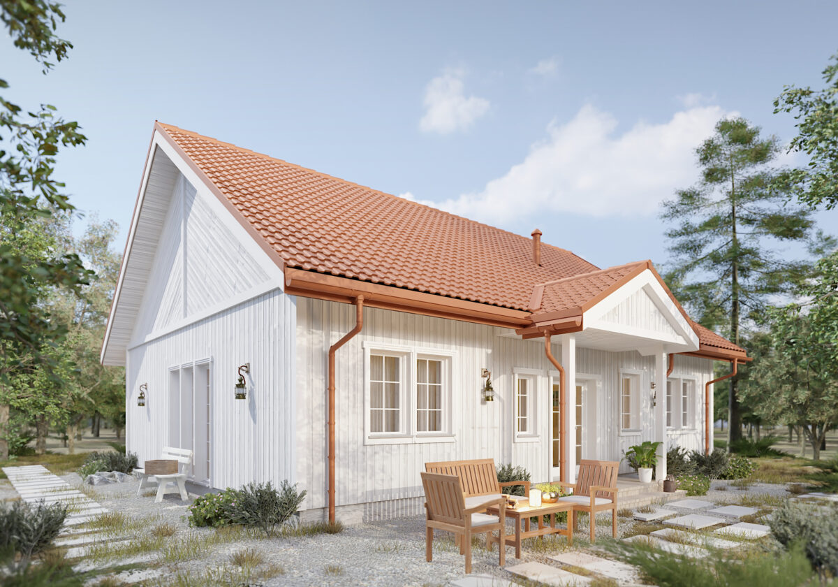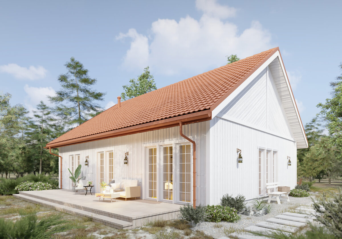Domek skandynawski o powierzchni 106 m2 jest niezwykle często wybieranym projektem. Jest prosty ale ma w sobie wszystko, czego potrzeba rodzinie. W projekcie przewidziano trzy sypialnie, z których jedna może być główną sypialnią z własną garderobą. Dwie łazienki w tym domu niezwykle poprawiają komfort życia. Salon z kuchnią jest bardzo przestronny i przeszklony, dlatego może być ulubionym miejscem domowników.