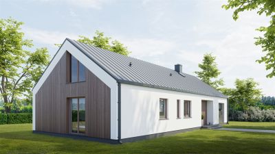 Nowoczesna Stodoła 140 to nowoczesny dom parterowy, zaprojektowany z myślą o 4–5-osobowej rodzinie. Posiada przemyślany i bardzo funkcjonalny układ pomieszczeń, który ułatwia codzienne życie i zapewnia komfort wszystkim domownikom.