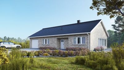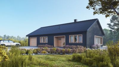 W budynek wkomponowany został garaż, z którego można swobodnie przejść do wiatrołapu, a następnie do części mieszkalnej.