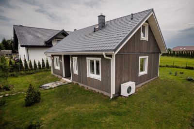 Domek ten posiada zwartą, prostą bryłę pokrytą dwuspadowym dachem, co w pierwszej kolejności czyni go tanim w eksploatacji i w budowie.