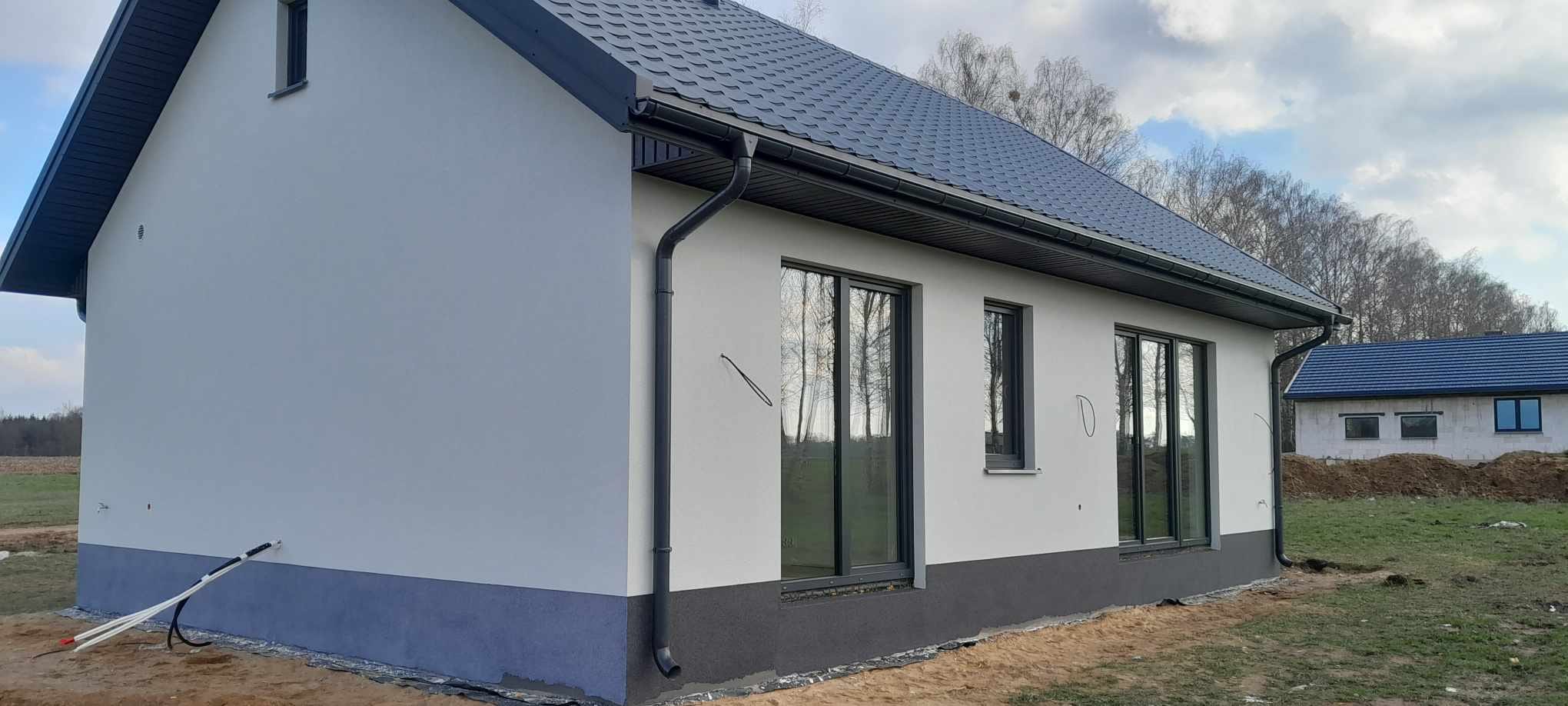 - Konstrukcję dachu na dźwigarach, ocieplenie połaci dachu zasypem z celulozy 30 cm oraz wykonanie pokrycia dachu.