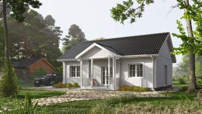 Projekt taki oferuje wygodne warunki dla rodziny lub osób starszych, eliminując konieczność korzystania z pięter czy schodów. Centralnie umieszczona łazienka jest praktyczna, a otwarta przestrzeń salonu z kuchnią tworzy przytulną przestrzeń do spędzania czasu razem. Powierzchnia 79 metrów kwadratowych zapewnia odpowiednią ilość miejsca dla codziennego życia.