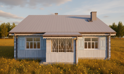 Detale – ozdobne listwy, rzeźbione szczyty, pastelowe okiennice – nadają mu lekkości i przywołują klimat dawnych podlaskich wsi. Duże przeszklenia od strony ogrodu otwierają wnętrze na naturalne światło i pozwalają w pełni korzystać z tarasu, który staje się przedłużeniem części dziennej. W środku zaplanowano wyraźny podział na strefę wspólną i prywatną. Salon z jadalnią (22,1 m²) tworzy najważniejsze miejsce domu – przestrzeń spotkań, odpoczynku i codziennych rytuałów. Z salonem współgra otwarta kuchnia (12,2 m²), która dzięki swojemu układowi oferuje dużo blatu i miejsca do przechowywania. Część prywatna obejmuje dwa pokoje: główną sypialnię (13,5 m²) oraz dodatkowy pokój (11,1 m²), który może pełnić funkcję pokoju dziecka, gabinetu lub pokoju gościnnego. Łazienka (6,1 m²) jest wygodna i dobrze rozmieszczona, a dopełnienie funkcjonalności stanowi duża kotłownia połączona z pralnią (10,7 m²), która realnie ułatwia codzienne obowiązki. Wejściowy wiatrołap (10,5 m²) oraz hol z miejscem na szafy zapewniają komfort organizacji przestrzeni i wygodę przy codziennym użytkowaniu. Dom sprawdzi się jako wygodne miejsce do życia dla 2–4 osób, które cenią spokojne, naturalne otoczenie i chcą mieszkać w domu o regionalnym charakterze, ale z nowoczesnym wnętrzem.