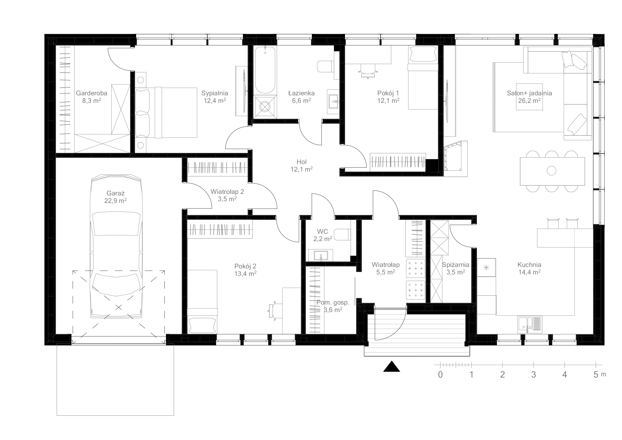 Dzięki przemyślanej bryle i stylowi inspirowanemu Skandynawią, dom ten łączy estetykę z energooszczędnością i wygodą użytkowania.