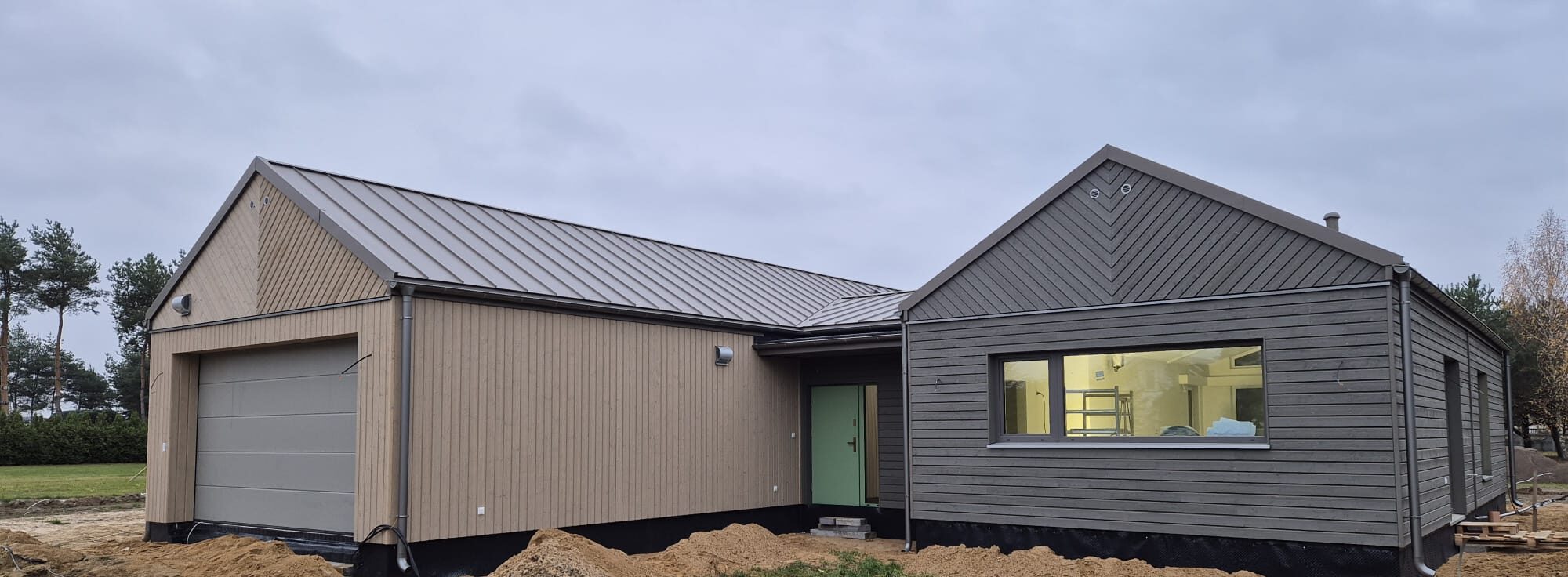 Elewację wykonano z drewna w stylu skandynawskim, z zastosowaniem różnych układów deski – pionowego, poziomego i w jodełkę – co nadaje całości niepowtarzalnego wyrazu. Dach bezokapowy wykończono blachą na rąbek, podkreślając nowoczesny charakter domu.