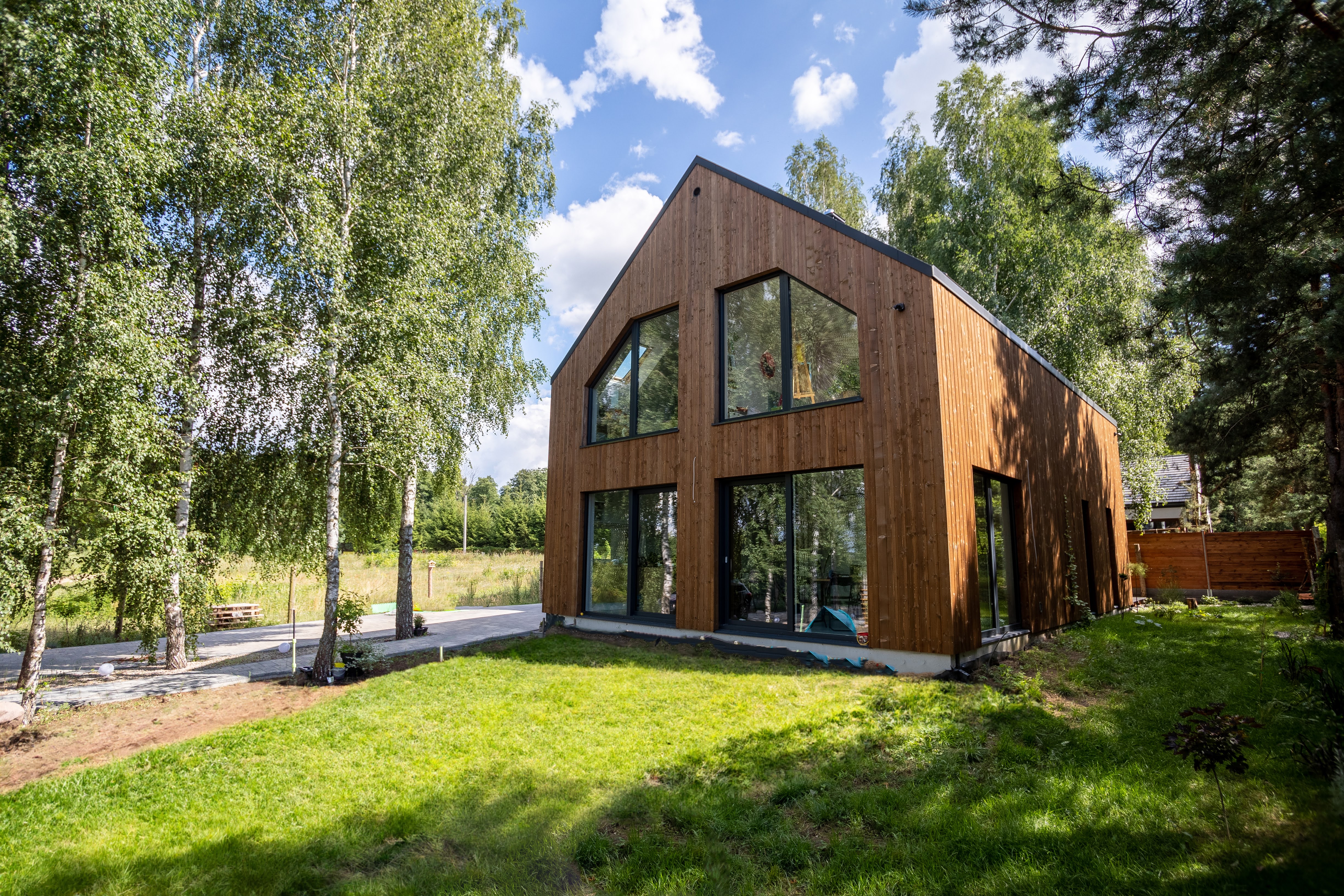 Stworzeniem murowanego garażu z żelbetowym stropem we własnym zakresie zajął się inwestor, natomiast my wykonaliśmy resztę w technologii szkieletowej. Powierzchnia całego domu wynosi 207 m2.