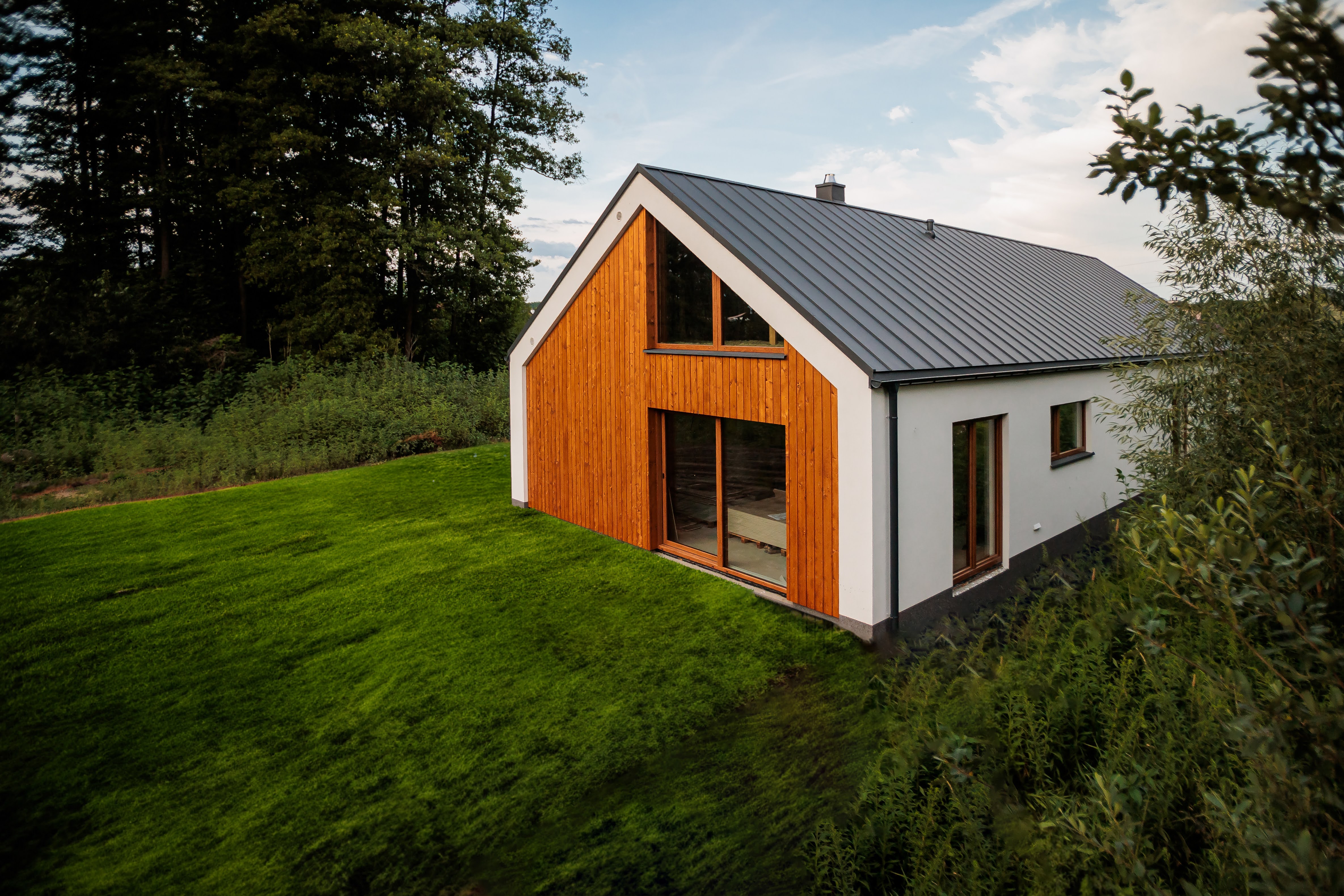 Duże przeszklenia w połączeniu z drewnianymi akcentami na elewacji dodają mu lekkości i charakteru, tworząc harmonijną całość wpisującą się w otoczenie.